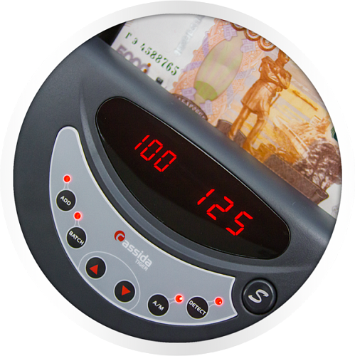 Сравнительно недорогой детектор Cassida Tiger I/IR обладает высокой скоростью счета: 1200 банкнот в минуту, инфракрасной и антистокс детекцией. Из детекций ошибок пересчета присутствуют следующие: детекция сдвоенности, детекция целостности, цепочка банкнот. Счетчик работает в следующих режимах: