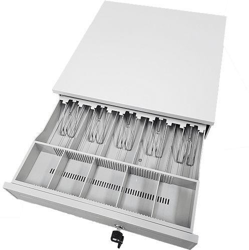На передней панели имеется щель для внесения крупных купюр в секретный отсек. Огромный денежный ящик CD-405-W подойдет для любого магазина и даже гипермаркета.