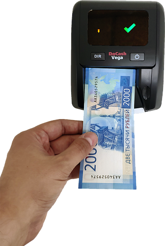 DoCash Vega проводит проверку подлинности российских банкнот со скоростью 100 банкнот в минуту с помощью 7 видов детекций. Работает от сети, но может быть опционально установлен аккумулятор. На экране отображается только информация о том, настоящая это купюра или поддельная.