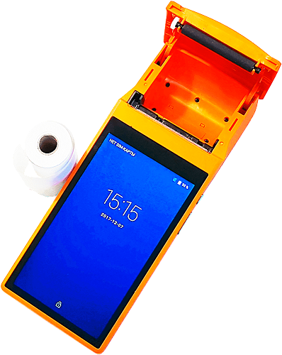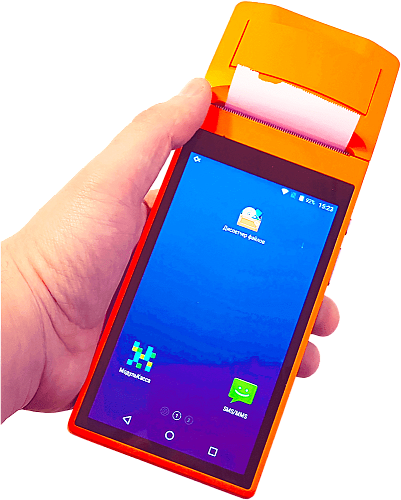 Мобильный кассовый терминал для курьеров оранжевого цвета (свое прозвище получила за цвет - "Оранжевая Касса"). Переносная POS-система.
