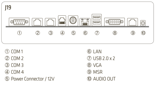 USB / COM (RS-232) / VGA / RJ-11 / Ethernet / RJ-45 / DC Jack