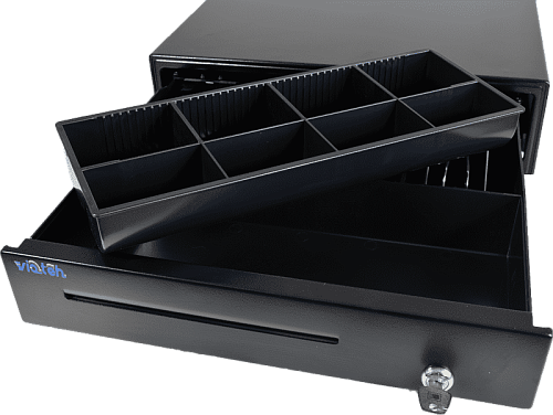 Простой бюджетный механический денежный ящик Vioteh HVC-09 черного цвета без автоматического замка. Имеется 4 отсека с прижимными клипсами для купюр и 8 для монет. Так же есть скрытый отсек. Денежный ящик предназначен для хранения денежной наличности при расчетах с населением с применением контрольно-кассовой техники (ККТ). Денежный ящик может использоваться без ограничения любым типом ККТ от автономных касс до фискальных регистраторов.